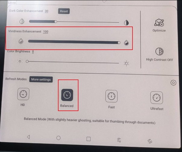 We suspect the issue is related to the refresh settings. In this case, you can open the notepad and swipe down from the top right to bring up the Control Center. Then, please click E Ink Center, please set the Vividness Enhancement to the max, and switch to Balanced mode.