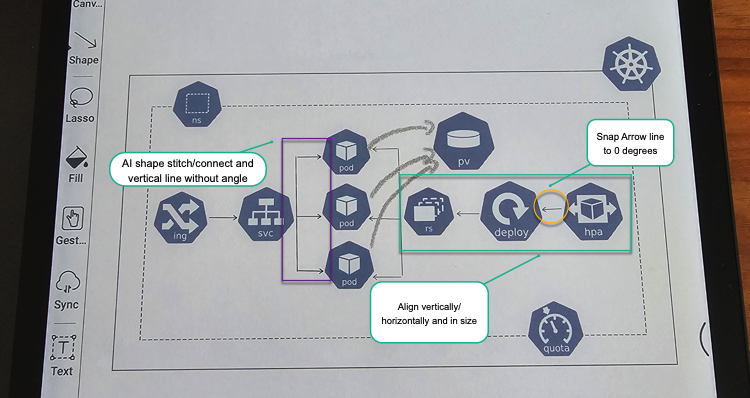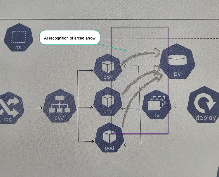 - AI recognition of multiple lines and connect them to one shape (see image 3.) See arrows from SVC to Pods. Today i have 4 individual lines (1 straight line and 3 arrows)