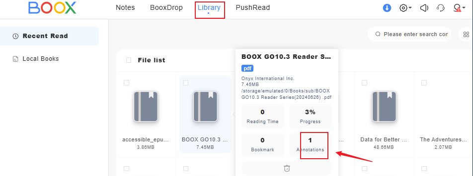 We apologize for the inconvenience. In this case, you can set up and log in to your Onyx account on your BOOX device. After that, please go to Library > Click the hamburger icon on the top right corner > Library Settings > enable "Sync all Reading Data to ONYX Account". Then, open the book that you read and close it. It will sync the reading data such as annotations, highlights, reading progress, and bookmarks to the Onyx cloud. Then, you can check the highlights on the other device by logging in to your account on the send2boox website (push.boox.com = US server / eur.boox.com = EUR server). After you log in, you can check the highlights or other reading data from the website.