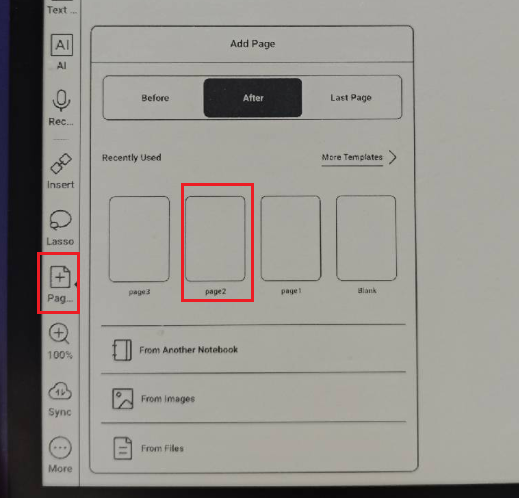 When you need to add a new page to the notepad, you can click the "Page" button on the toolbar to add a new page and set a different page of template for the new page.