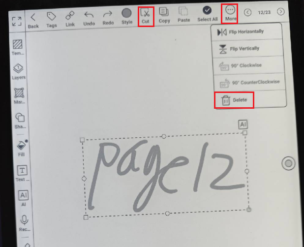 Next, less important but potentially useful, would be to add functionality to AI selection of the text. Currently, when circling around a text, the AI box appears around it with the main function of transforming the handwritten note to text. It would be great to add to the selected AI box additional micro icon (similar to the current Rotation icon displaying in the lower right corner of the selection). That icon would be Delete (trash bin), so that it would work as kind of Lasso Eraser.