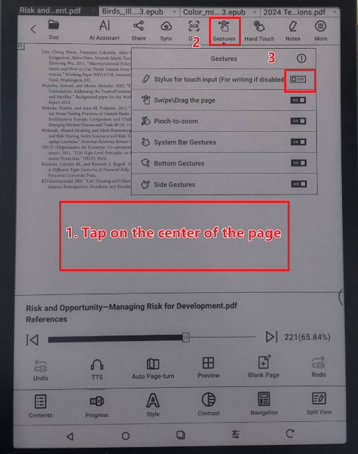 We apologize for the inconvenience. In this case, you can open the PDF. Then you can follow the steps below to turn on "Stylus for touch input". After that, please check if it is possible to fix the problem.