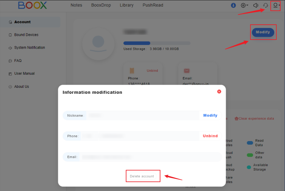 In this case, you can log in to your email account on the website push.boox.com(US server) or eur.boox.com(EUR server) first. Then, you can follow the steps below to delete your email account.