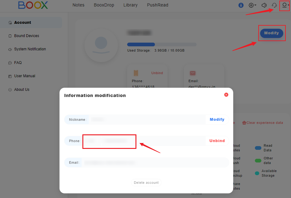 In this case, we are wondering if you have ever logged in to your Onyx account on the send2boox website (push.boox.com = US server / eur.boox.com = EUR server) on your computer before. If so, you can bind your phone number to your account via the steps below and use your phone number to log in to your BOOX device.