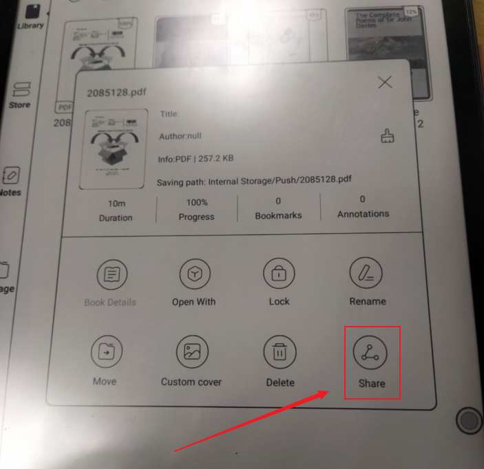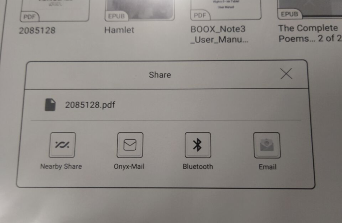 In the BOOX device. You could also long-press a document to select different options to share it. If you installed third-party apps like google drive, Evernote, etc. It will also show more options when sharing a document.
