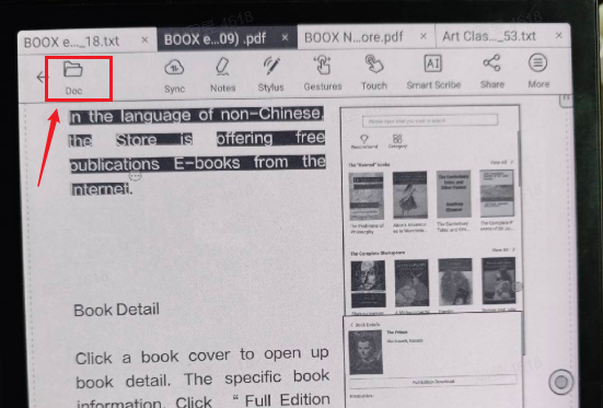 After you open a document, you can tap on the center of the page to bring up the menu. Then, you can switch to another document by tapping the tabs at the top of the page.