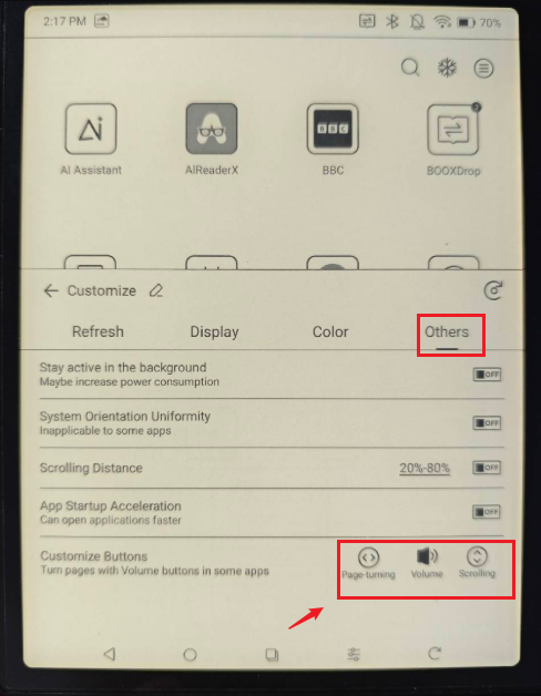 I am unable to change the buttons to be page turners. I did for each app. But Boox requires the volume but I can’t see that as an option