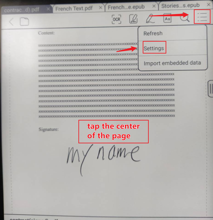 1) Tap on the center of the page and click "Settings".