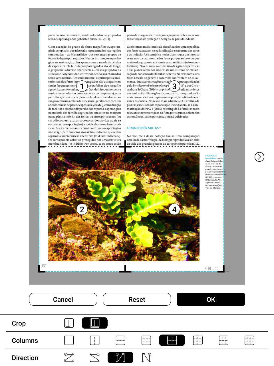 To read it, one would select Navigation mode and tweak it in the ⚙More section (selecting the two page icon in Crop and the 4-parts division icon in Column).